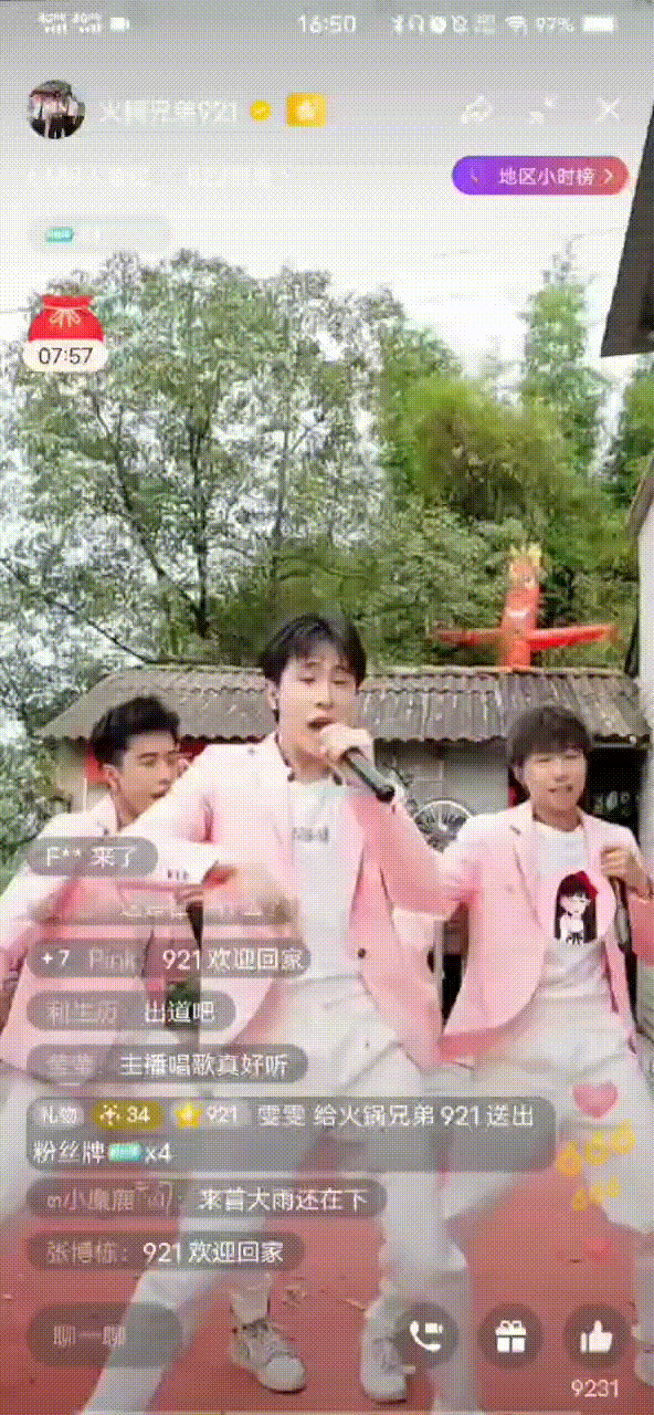 2022年4月13日,@火锅兄弟921 开始在视频号直播。然而疫情原因,户外直播改为室内直播。三个小伙穿着校服在宿舍中载歌载舞,勾起许多观众的青春校园回忆,半个月直播间的最高场观达到7000-8000人每场。
